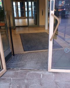 Lasipalatsin aukion puolella ovelle johtaa ramppi. Ovella on matala kynnys. Ovi avautuu avauspainikkeella.