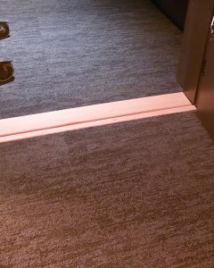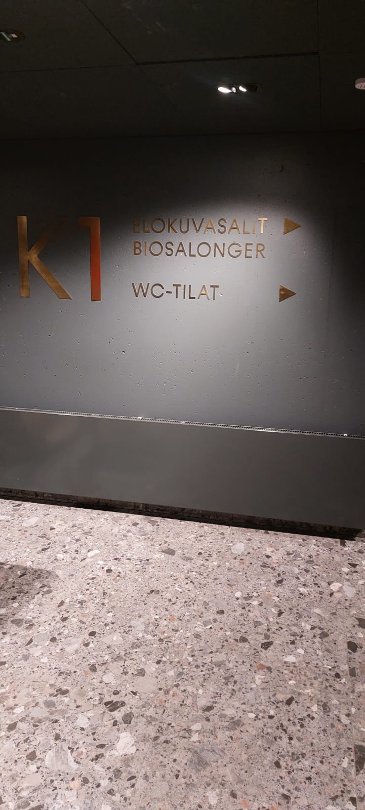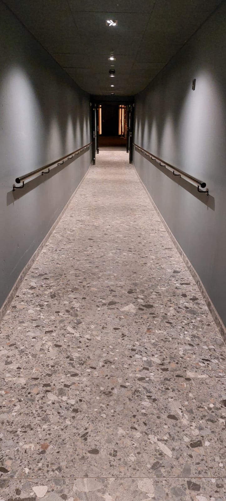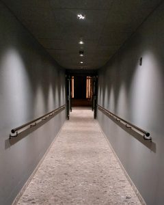 Pohjakerroksessa hisseiltä on opasteet saleihin. Käytävä viettää loivasti alas.