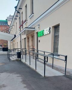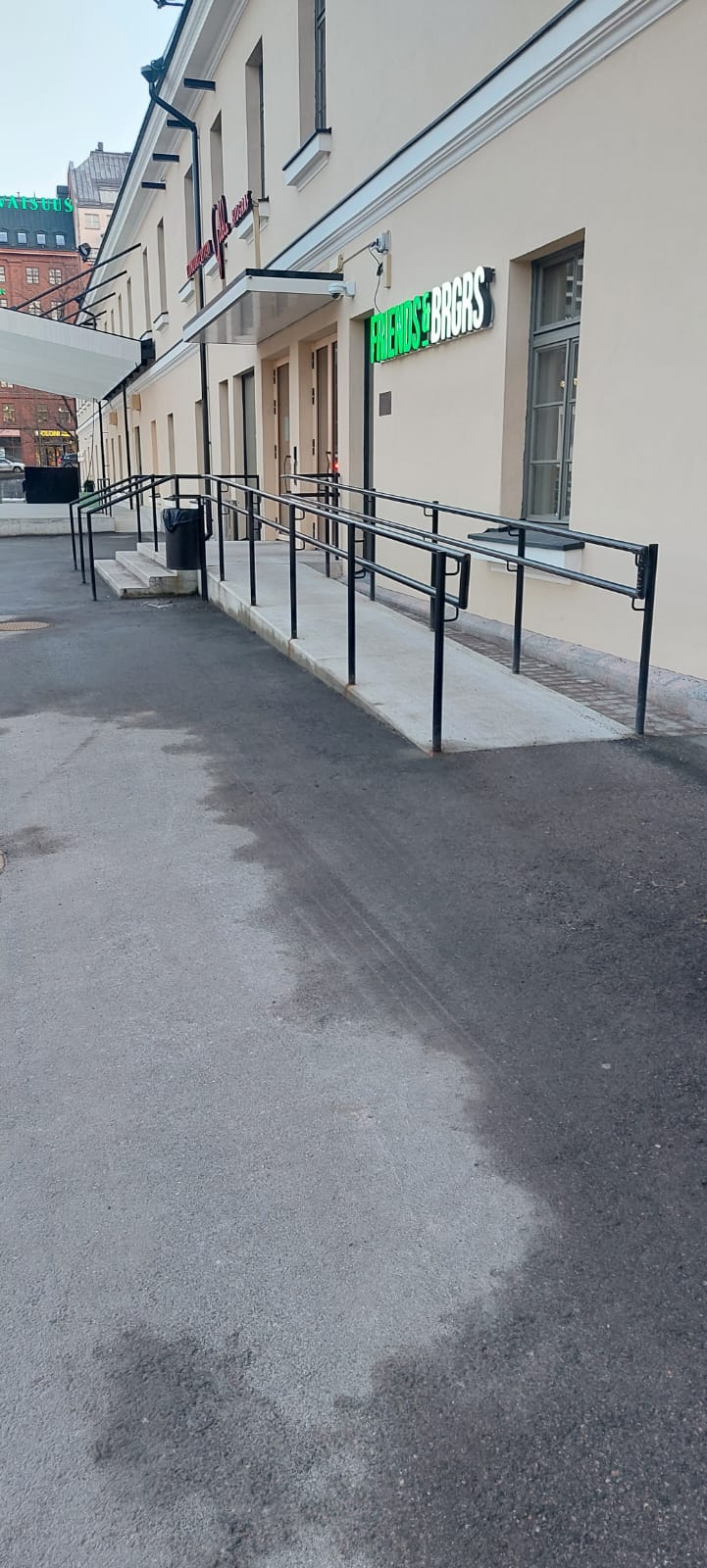 Narinkkatorin puoleinen sisäänkäynti on katutasossa ja tuulikaapissa on luiska. Ovien kohdalla on matalat kynnykset. Ovet aukeavat avauspainikkeella.